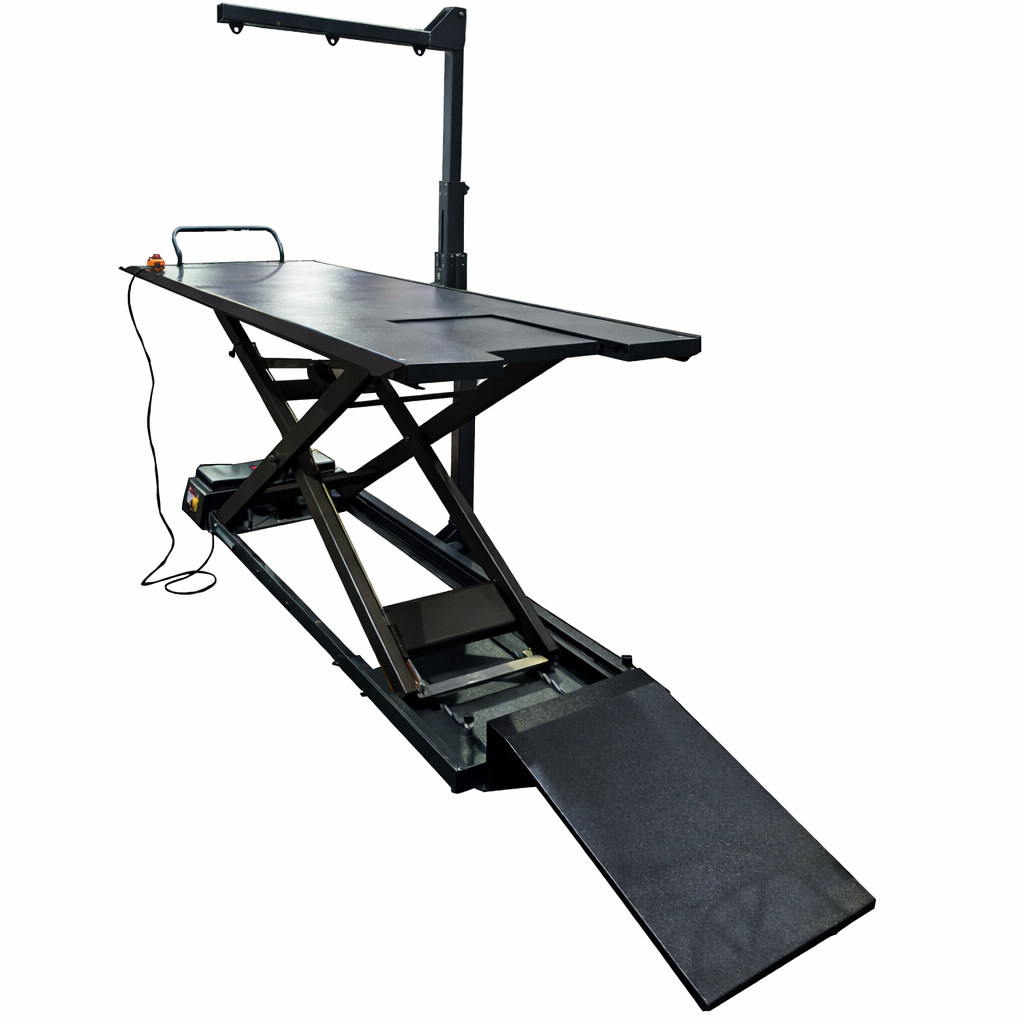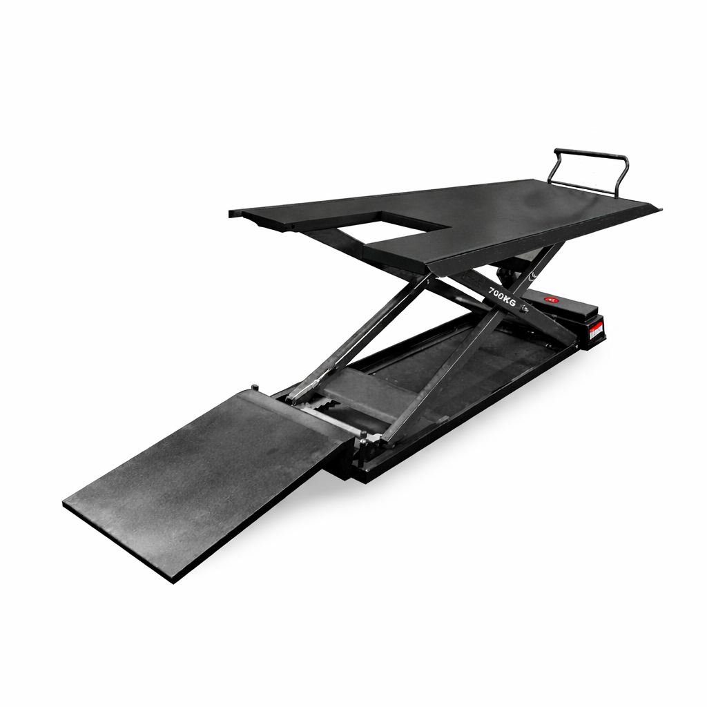 Professional JMP 700 Lux hydraulic jack with electro-hydraulic pump, designed for motorcycle workshops and handling heavier motorcycles. With a load capacity of up to 700 kg, a large working platform and a robust design, the 700 Lux is ideal for intensive daily service work.