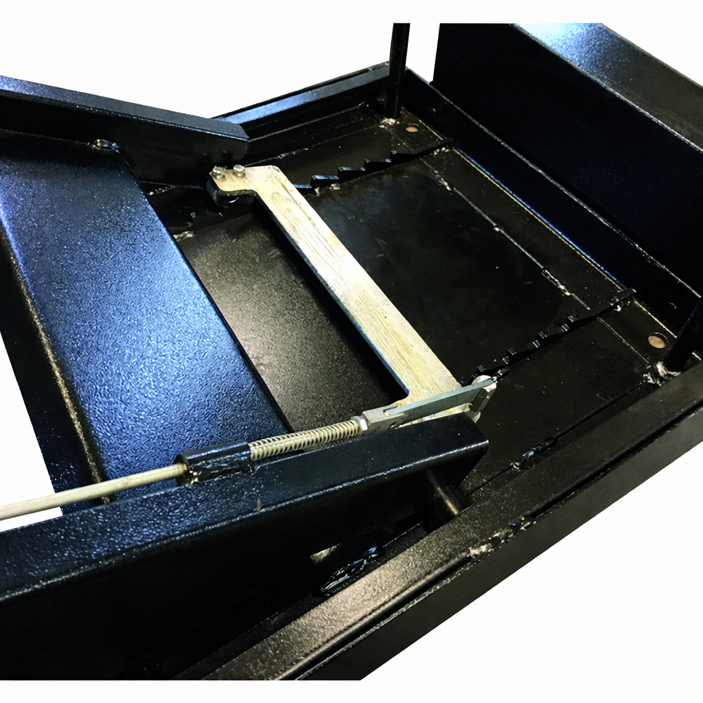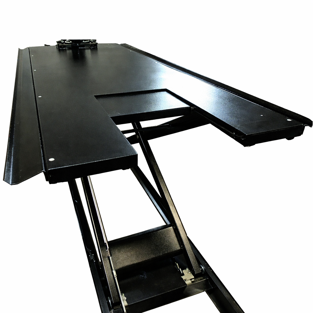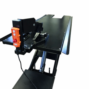 The electro-hydraulic pump is powered by a standard 230 V / 50 Hz socket and is controlled via a remote UP/DOWN switch. The lift is CE certified (EC declaration of conformity), which is required in workshops employing employees.
