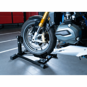A sturdy bracket (dock) for the front wheel of the motorcycle with a self-locking mechanism, ensuring stable and safe immobilization of the vehicle. Ideal for transport on a trailer as well as for parking your motorcycle in a workshop or private garage.