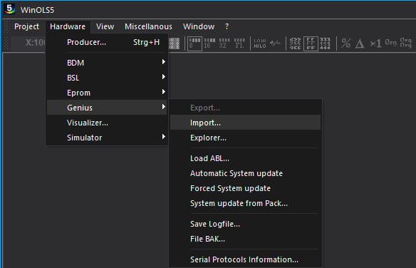 After installation, the plug-in adds a dedicated NewGenius menu directly in WinOLS, allowing convenient operation of the device from the program.