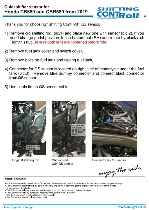 Czujnik quickshifter przeznaczony do motocykli Honda CB 650 oraz Honda CBR 650 od rocznika 2019, umożliwiający bezsprzęgłową zmianę biegów w górę przy pełnym otwarciu przepustnicy.