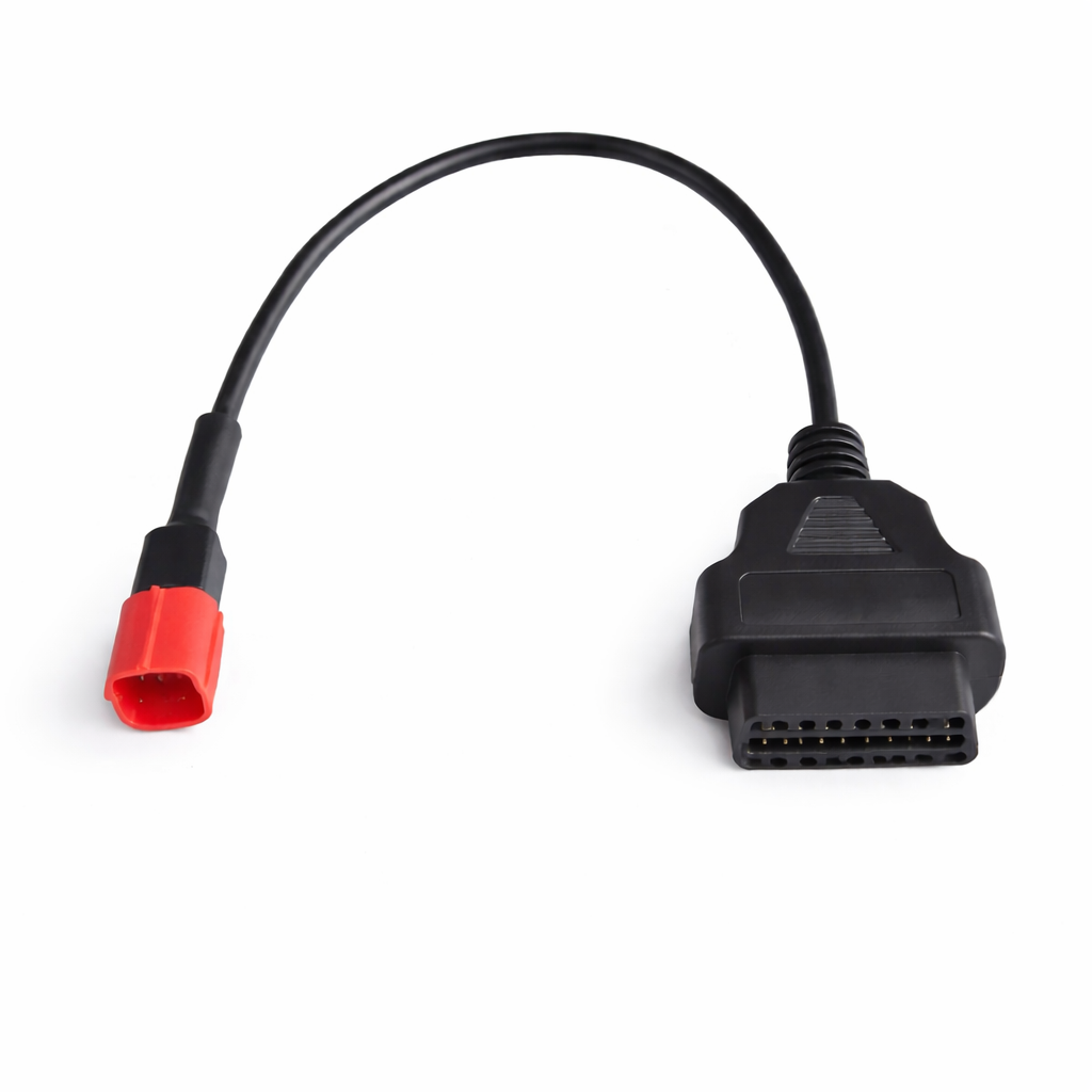 Profesjonalny kabel diagnostyczny OBD przeznaczony do nowoczesnych motocykli wyposażonych w magistralę CAN oraz czerwone 6-pinowe złącze serwisowe, stosowane w wielu modelach od około 2017 roku wzwyż.