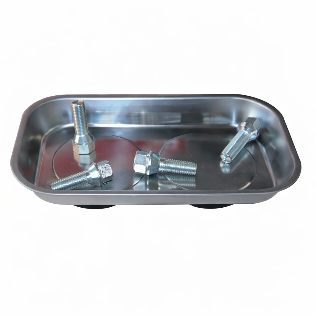Praktyczna magnetyczna miseczka warsztatowa, przeznaczona do bezpiecznego przechowywania śrub, nakrętek oraz drobnych elementów podczas prac serwisowych. Dzięki większej powierzchni doskonale sprawdzi się przy bardziej rozbudowanych pracach montażowych.