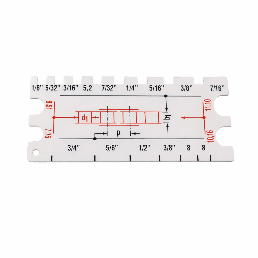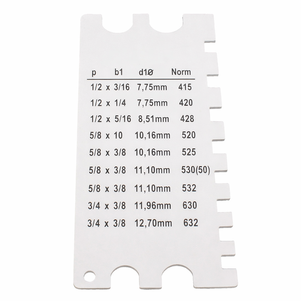 Praktyczny przyrząd pomiarowy do określania rozmiaru motocyklowych łańcuchów napędowych, przeznaczony do sytuacji, w których oznaczenie łańcucha jest nieczytelne lub całkowicie niewidoczne. Narzędzie umożliwia szybkie i jednoznaczne ustalenie właściwego rozmiaru łańcucha, oznaczanego standardowo w zakresie od 415 do 632.