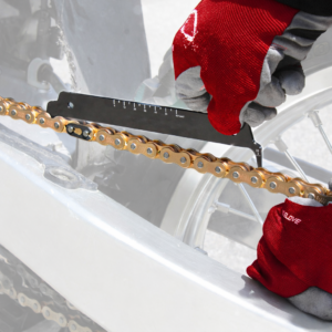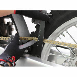 Przyrząd wskazuje zużycie łańcucha do 2%, a skala umieszczona w centralnej części umożliwia dodatkowo pomiar i regulację luzu łańcucha, czyniąc narzędzie wyjątkowo uniwersalnym w codziennej obsłudze motocykla.